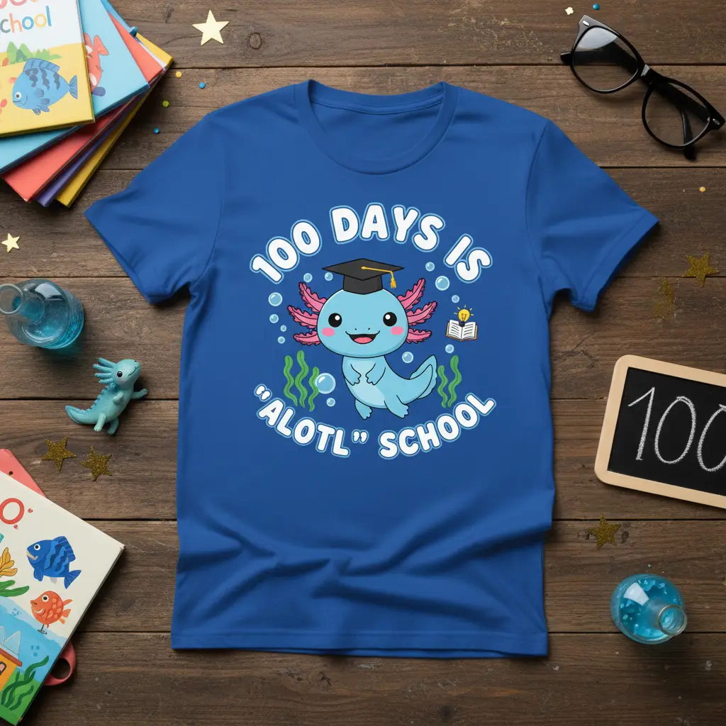The vibrant blue of the t-shirt serves as a perfect backdrop for the cheerful design. The playful font and bubbly accents add to the overall whimsical feel. It’s more than just clothing; it’s a conversation starter and a proud declaration of reaching a learning goal. This 100 Days Is “Alotl” School design is ideal for any student who loves cute animals and fun school themes.