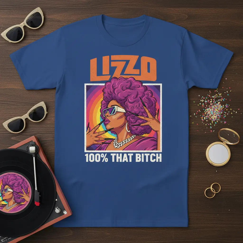 This striking graphic tee features the unforgettable “100% THAT BITCH” slogan, paired with a captivating illustration of Lizzo. Her signature purple afro, stylish sunglasses, and confident pose exude charisma and empower the wearer. The vibrant, rainbow-like background adds a retro flair, making this design pop and stand out from the crowd. It’s a must-have for any fan looking to channel their inner fierceness.
