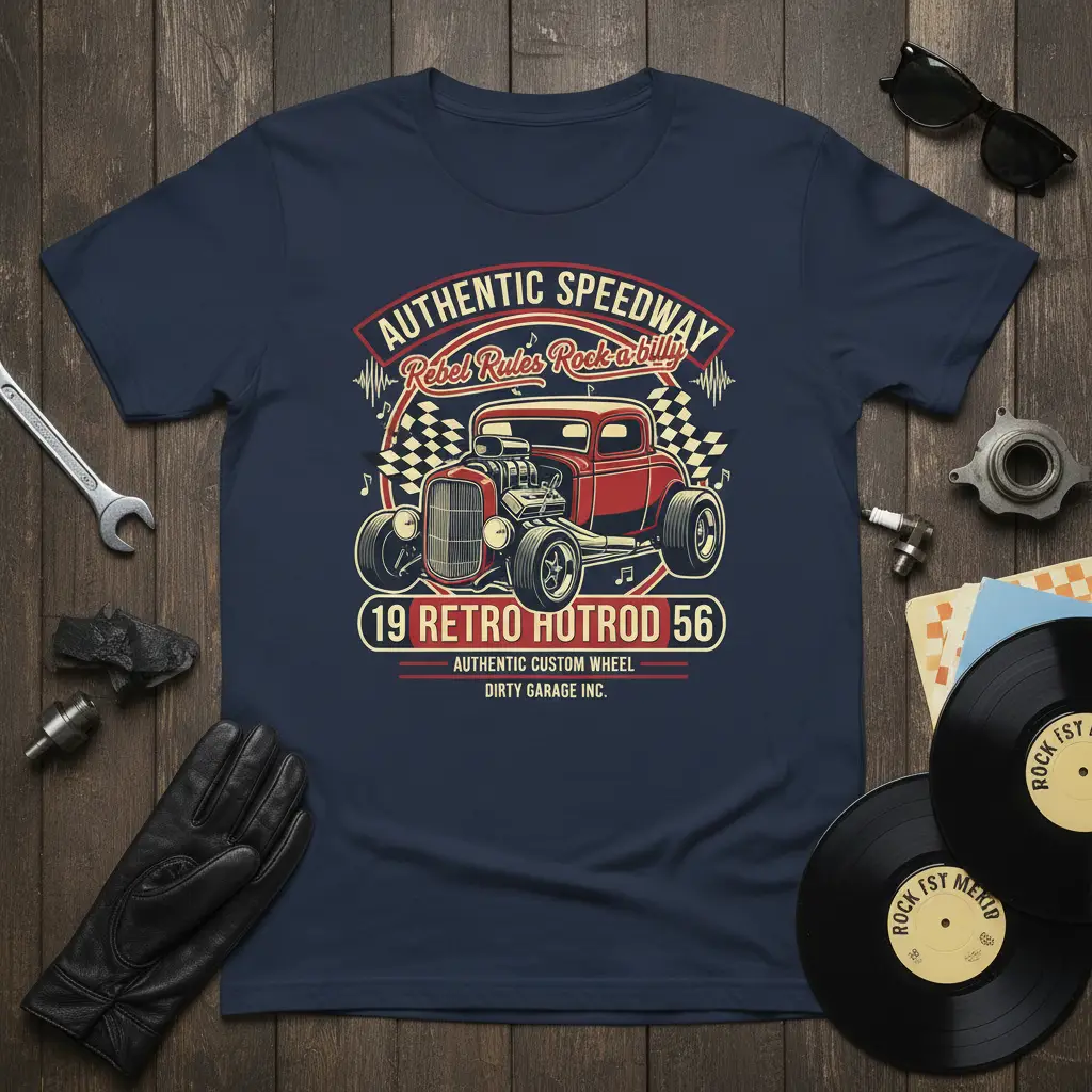 The “Authentic Speedway” banner at the top sets the stage for a journey back in time, evoking the thrill of the race and the open road. The checkered flags and musical notes woven into the design further enhance the rockabilly theme, creating a visually dynamic and engaging piece. Every element is thoughtfully placed to resonate with those who appreciate the craftsmanship and artistry behind these legendary vehicles. This t-shirt is designed to be a conversation starter, connecting you with fellow car lovers who share your admiration for these timeless machines.