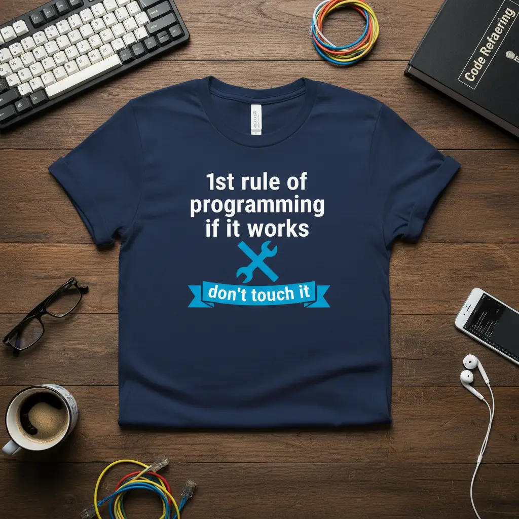 1st rule of programming if it works don’t touch it! This sentiment resonates deeply within the tech community, embodying a practical, no-nonsense approach to software development. This t-shirt is more than just apparel; it’s a badge of honor for coders, developers, and anyone who understands the delicate balance of making technology function. Whether you’re debugging complex code or deploying a new feature, this design captures the essence of IT wisdom. It’s a conversation starter and a comfortable way to express your passion for all things tech.