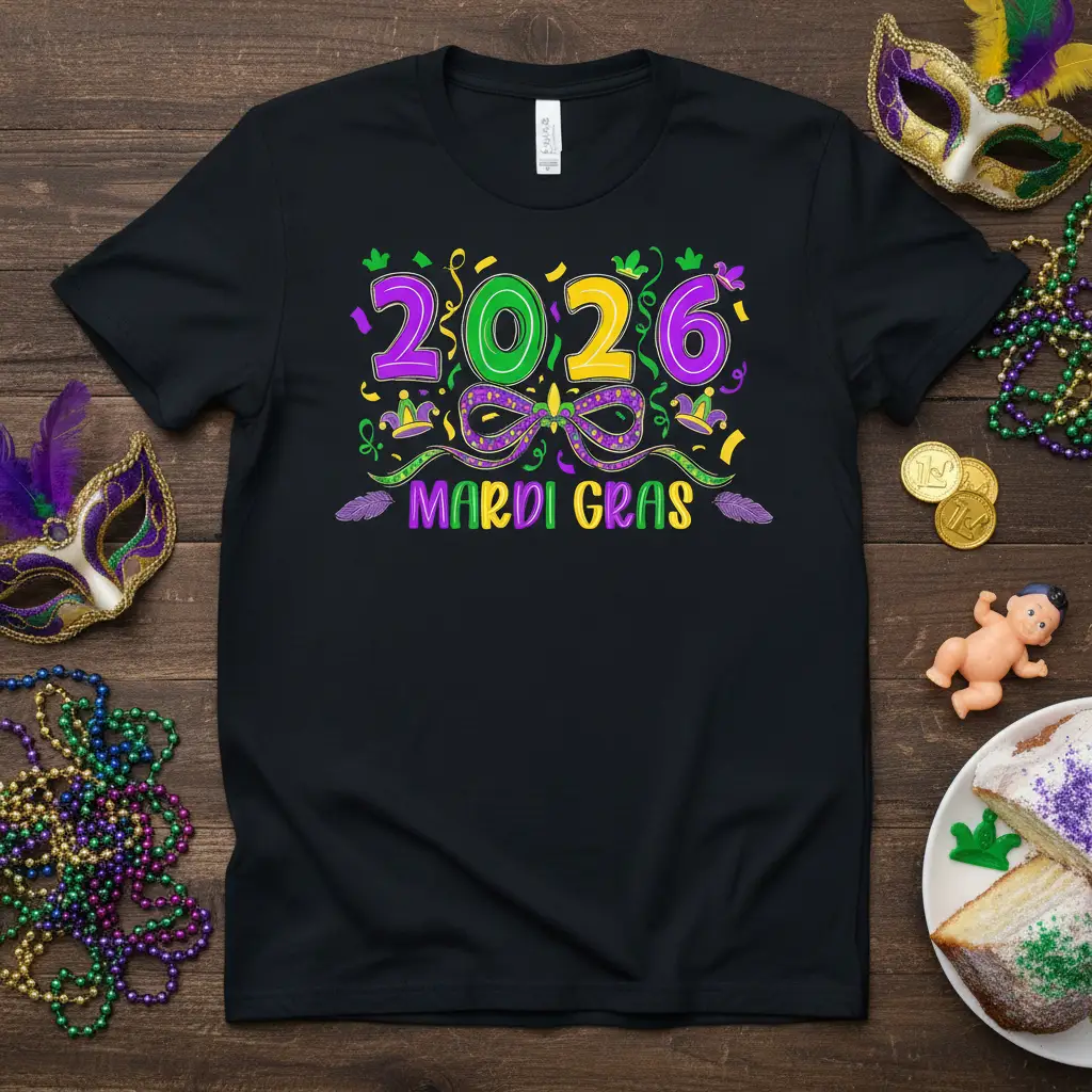 The design features the year “2026” prominently displayed in a playful mix of purple, green, and yellow, the quintessential colors of Mardi Gras. Beneath the numbers, the iconic “MARDI GRAS” text pops with equally festive flair. Adorned with confetti and a delightful bow graphic, this shirt embodies the spirit of fun and revelry that defines this beloved celebration.