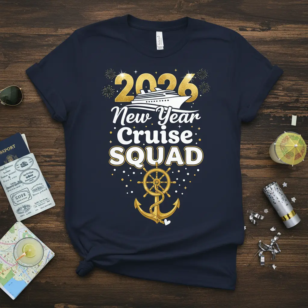 The 2026 New Year Cruise SQUAD t-shirt is more than just apparel; it’s a symbol of friendship, fun, and new beginnings. Featuring a striking design with festive fireworks, a sleek cruise ship graphic, and a classic anchor with a ship’s wheel, this tee captures the spirit of a grand voyage. The vibrant gold and white lettering stands out, making it a perfect keepsake for your entire group.