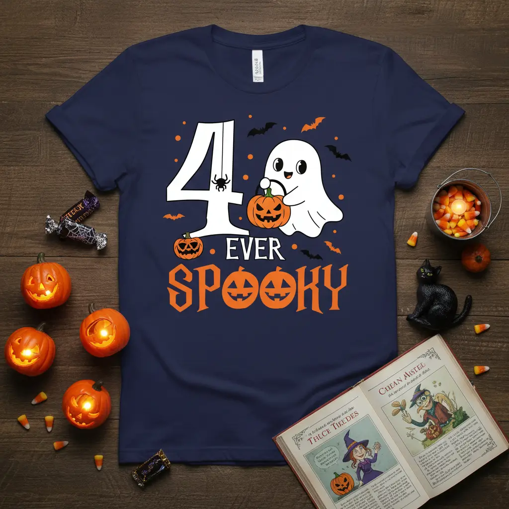 This charming t-shirt proudly displays the phrase “4 EVER SPOOKY,” making it a standout choice for any child’s fourth birthday party or Halloween festivities. The design artfully blends the excitement of a birthday milestone with the playful spookiness of Halloween. It features a friendly ghost character, iconic pumpkins, and subtle bat accents, all rendered in a fun, kid-friendly style. The bold typography ensures the message is clear and festive.