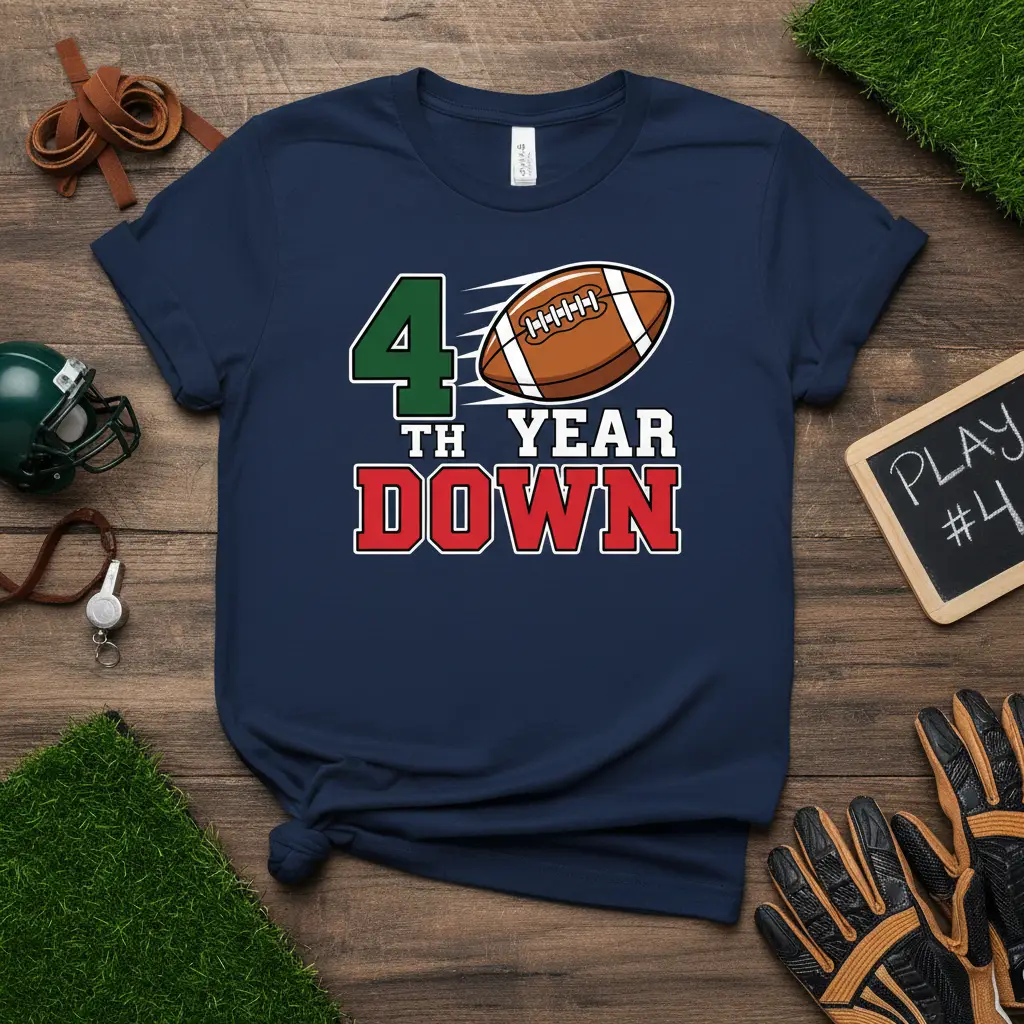 This unique t-shirt design commemorates a significant milestone, making it the perfect way to celebrate any football fan’s journey. The bold “4TH YEAR DOWN” graphic, coupled with a dynamic football illustration, embodies the spirit of the game. It’s an ideal piece of apparel for anyone who lives and breathes football, whether they are a player, a coach, or a dedicated supporter.