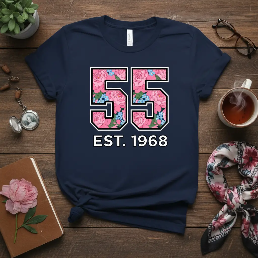 Celebrate 55 Years: The “55 EST. 1968” Floral Birthday T-Shirt