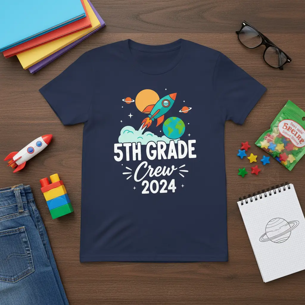The “5th Grade Crew 2024” theme is perfect for back-to-school celebrations, class photos, or as a special gift for the end of the academic year. It’s a fantastic way for students to feel connected and proud of their accomplishments. The design is universally appealing, resonating with both students and educators who appreciate a touch of cosmic fun.