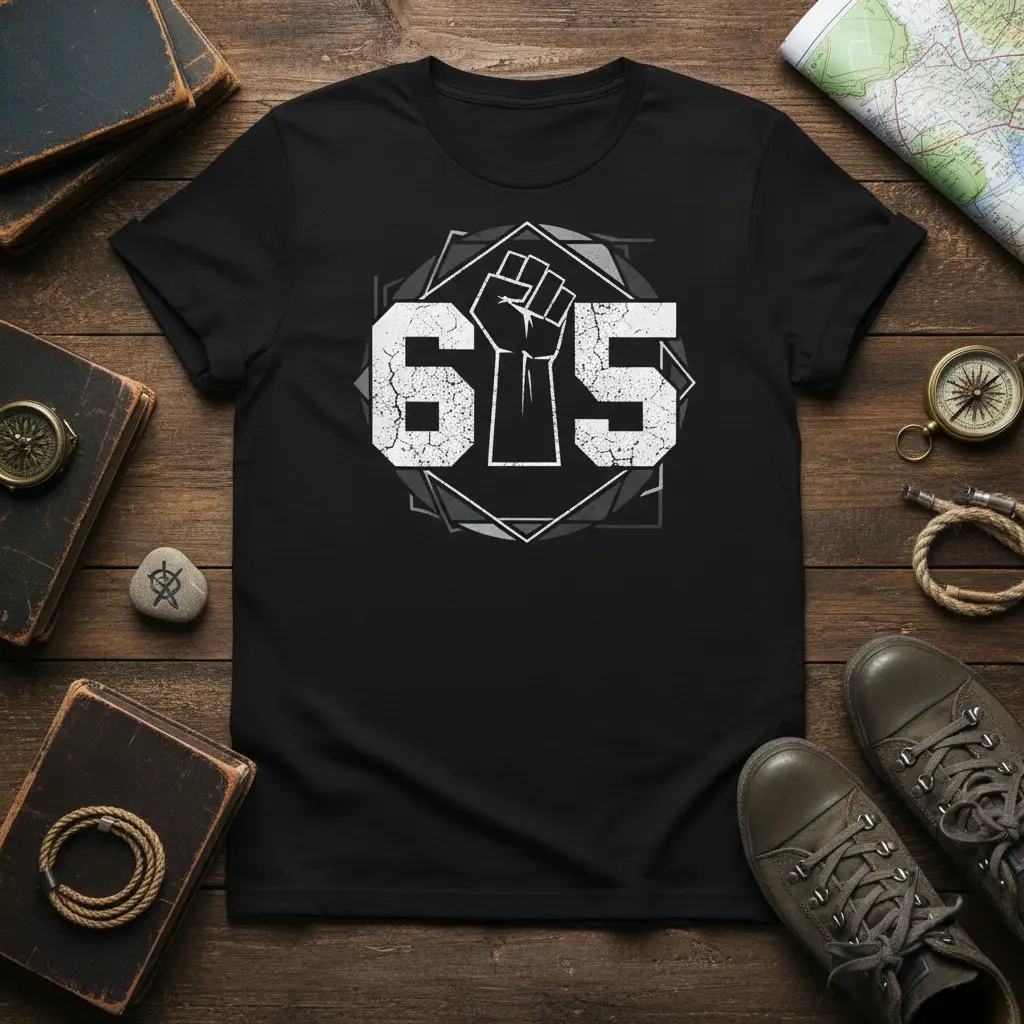 This t-shirt prominently features the 615 area code in bold, distressed white lettering, making a clear and impactful statement. The design is enhanced by a powerful raised fist graphic, symbolizing strength, unity, and resilience within the community. Encased within a modern geometric frame, the entire graphic has a distinctive, eye-catching appeal that stands out. It’s a design that resonates with the pride and spirit of Nashville and its surrounding areas.