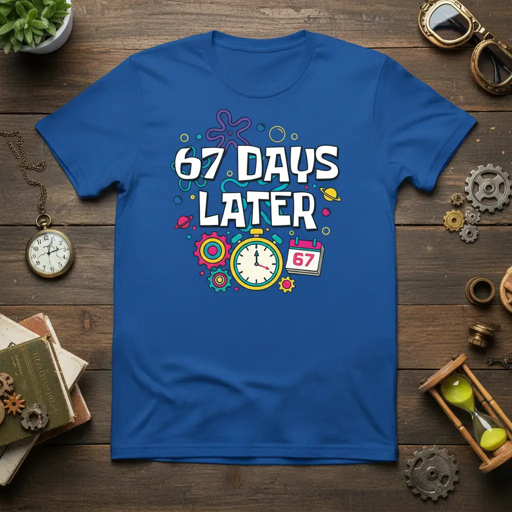 This eye-catching t-shirt proudly displays the phrase “67 DAYS LATER” in a fun, animated font that evokes a sense of playful nostalgia. The design is surrounded by whimsical graphics including a clock face, a calendar, gears, and celestial elements, all reminiscent of classic cartoon styles. It’s a perfect way to show your appreciation for iconic animated series and express your unique sense of humor.