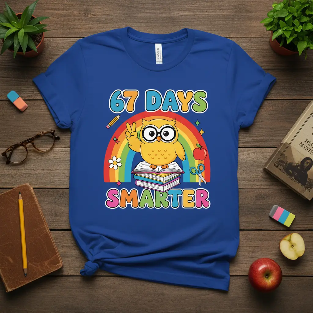 67 Days Smarter is a fantastic milestone to celebrate, and this t-shirt is the perfect way to show it off! Designed for students and teachers alike, this vibrant tee captures the joy and achievement of reaching this significant point in the school year. Featuring a whimsical owl perched on books with a bright rainbow, it’s a fun and eye-catching way to commemorate learning and progress. It’s more than just apparel; it’s a wearable badge of honor for all the hard work and dedication put into education.