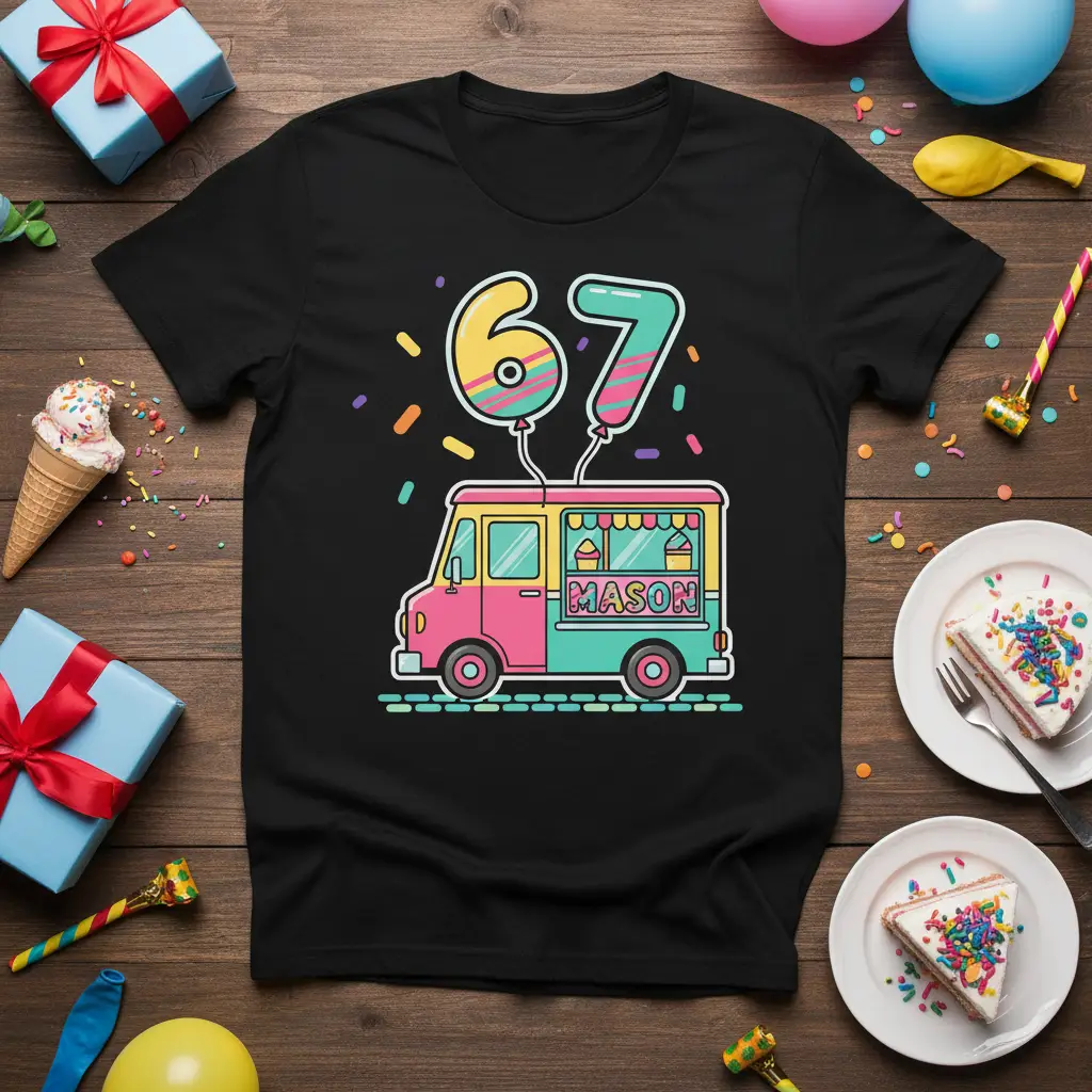 This eye-catching design features a delightful cartoon ice cream truck, rendered in cheerful pinks, yellows, and teals. Floating above the truck are two large balloons, playfully shaped as the numbers “67,” signifying the special age being celebrated. The name “Mason” is prominently displayed on the truck’s service window, making this shirt a personalized treasure for the birthday boy or girl.