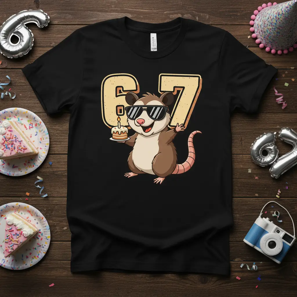 This eye-catching design captures the spirit of celebration with a fun-loving opossum at its center. The bold “67” prominently displayed signifies the milestone birthday in a playful way. It’s more than just a shirt; it’s a statement piece that embodies a fun-loving attitude and a zest for life.