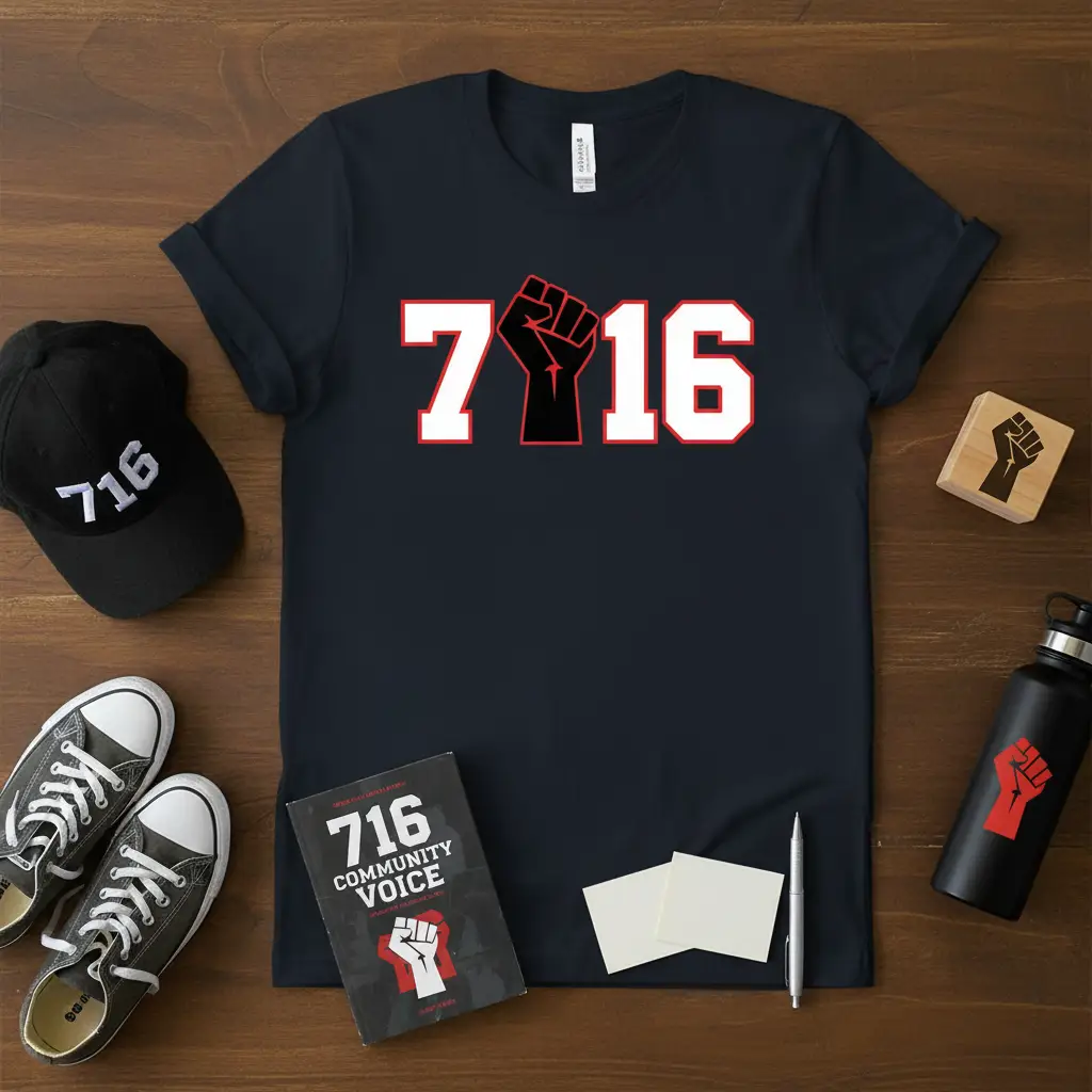 The design features the numbers “716” in crisp white lettering with a striking red outline, making it pop against the deep navy fabric. Replacing the ‘1’ in “716” with a solid black raised fist adds a layer of powerful symbolism, representing resilience, solidarity, and collective action within the community. This thoughtful detail elevates the shirt beyond a simple representation of an area code.