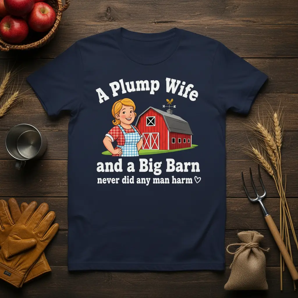 This unique t-shirt celebrates the spirit of the countryside with its witty slogan and adorable illustration. The phrase “A Plump Wife and a Big Barn” evokes images of traditional farm life, suggesting a sense of abundance, comfort, and security. The accompanying graphic, featuring a cheerful farm wife and a quintessential red barn, adds a visual narrative to the text. It’s a design that speaks to a love for the land and the simple, honest values associated with farming communities.