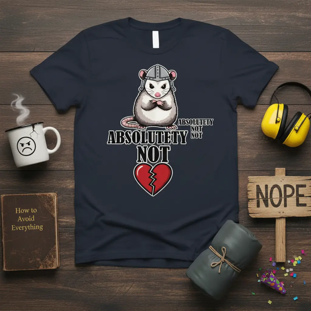 This unique tee showcases a determined opossum, complete with a knight’s helmet, exuding an aura of firm refusal. The accompanying text, “ABSOLUTELY NOT NOT NOT,” is bold and impactful, leaving no room for misinterpretation. It’s designed for those who appreciate witty humor and bold statements, offering a fun way to communicate your feelings without saying a word. This shirt is sure to become a favorite in your collection.