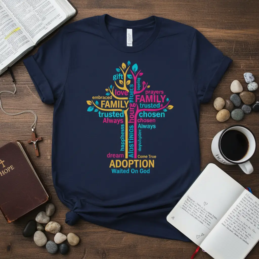 This unique t-shirt features a stunning cross-shaped word cloud, symbolizing the spiritual foundation often present in adoption stories. Words like “Family,” “Love,” “Embraced,” “Trusted,” and “Chosen” interweave to form the cross, highlighting the core values of adoptive bonds. The prominent display of “ADOPTION” and “Waited On God” speaks to the perseverance and faith required on this path.