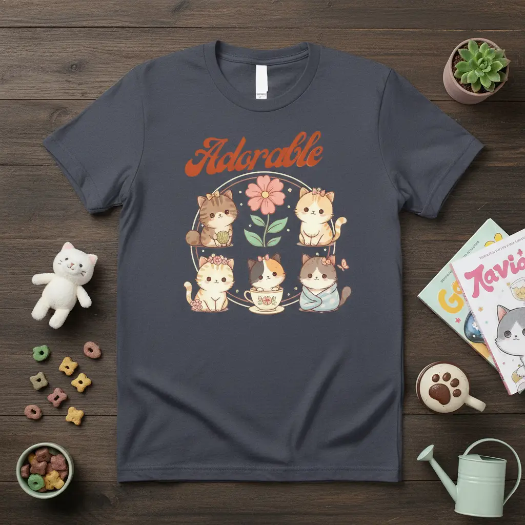 The phrase “Adorable” itself is presented in a stylish, retro-inspired font that perfectly complements the vintage feel of the illustrations. This combination creates a look that is both timeless and trendy, appealing to a wide audience. Whether you’re a seasoned cat mom or simply appreciate cute animal designs, this shirt promises to be a conversation starter and a source of daily delight.