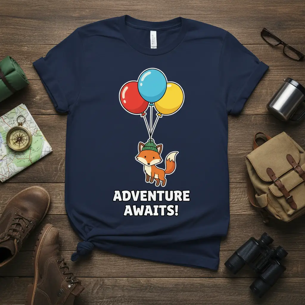 ADVENTURE AWAITS! This inspiring t-shirt is designed for the spirited individual who thrives on new experiences and embraces the call of the wild. Featuring a whimsical fox playfully ascending with vibrant balloons, this tee perfectly encapsulates the thrill of exploration and the joy of setting out on a new journey. It’s more than just apparel; it’s a wearable reminder to embrace curiosity, seek out new horizons, and live life to the fullest. The charming design and motivational message make it an ideal companion for all your outdoor escapades and everyday adventures.