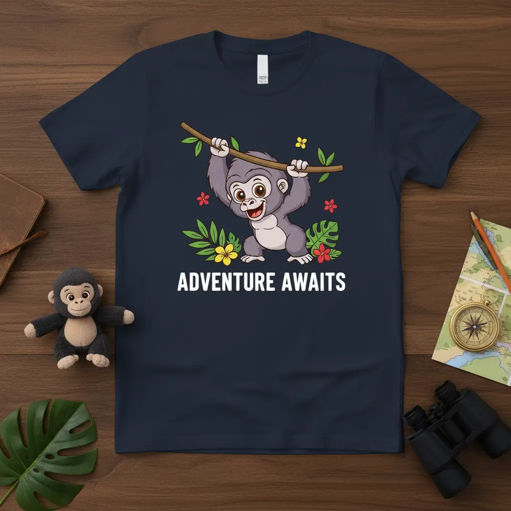 Adventure Awaits on this captivating t-shirt, designed for the spirited explorer in all of us. This garment is more than just apparel; it’s a statement piece that calls to those who yearn for new experiences and embrace the thrill of the unknown. Featuring a delightful cartoon monkey swinging joyfully amidst lush foliage, this design perfectly encapsulates the excitement of embarking on a grand expedition. It’s crafted for comfort and style, making it your ideal companion for any journey, whether it’s a safari or just your daily commute.