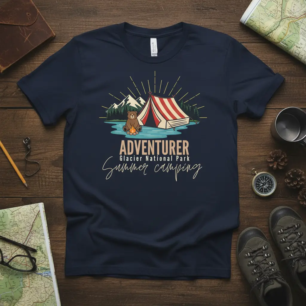 ADVENTURER Glacier National Park Summer camping is more than just a phrase; it’s a call to the wild and an invitation to explore the breathtaking landscapes of Glacier National Park. This t-shirt is designed for those who feel the pull of the mountains, the allure of the campfire, and the freedom of the open trail. It embodies the spirit of adventure that defines summer camping trips and the unforgettable memories created amidst nature’s grandeur. Wearing this tee is a declaration of your love for the great outdoors and your appreciation for the national parks that protect these precious spaces.