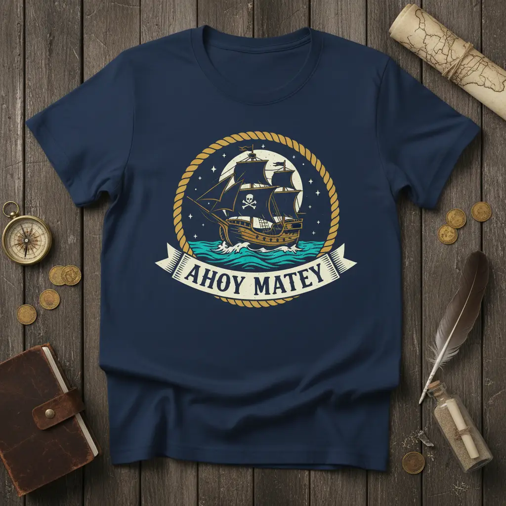 The phrase “Ahoy Matey” is emblazoned across a banner, serving as a friendly greeting from the high seas. This design is a fantastic way to express your passion for maritime history, sailing, or simply your adventurous spirit. It’s ideal for themed parties, casual wear, or as a unique gift for the pirate enthusiast in your life.