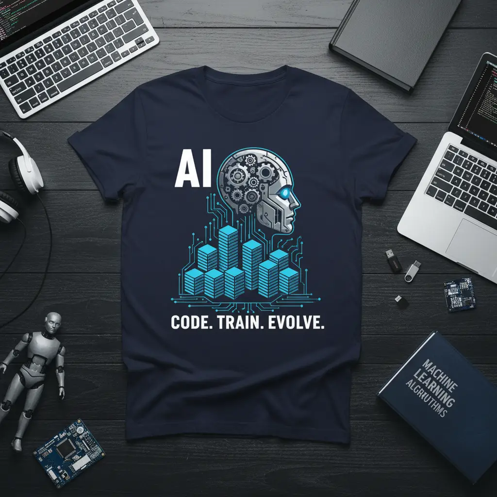 The visual elements are meticulously chosen to represent the complexity and beauty of AI. The robotic head symbolizes intelligence and consciousness, while the gears suggest the intricate mechanisms that drive it. The stacked blocks create a sense of progress and growth, mirroring the learning and development inherent in AI models. This AI CODE. TRAIN. EVOLVE. design is a conversation starter, perfect for tech meetups, coding sessions, or casual wear.