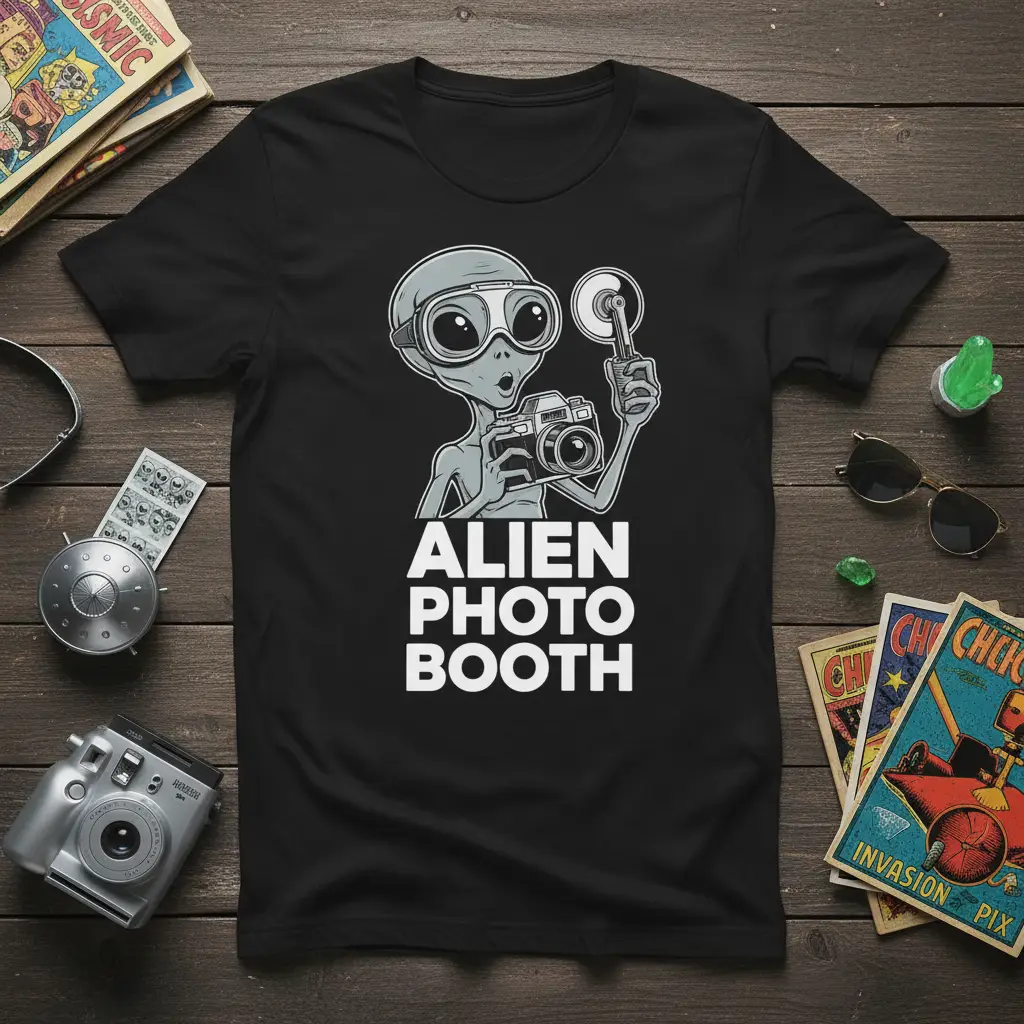 This ALIEN PHOTO BOOTH design blends elements of science fiction and photography, appealing to a broad audience with its imaginative concept. Whether you’re a seasoned photographer, an avid stargazer, or simply someone who enjoys unique t-shirt designs, this piece offers a fun way to express your interests. It’s more than just a shirt; it’s a statement about embracing the weird and wonderful aspects of life.