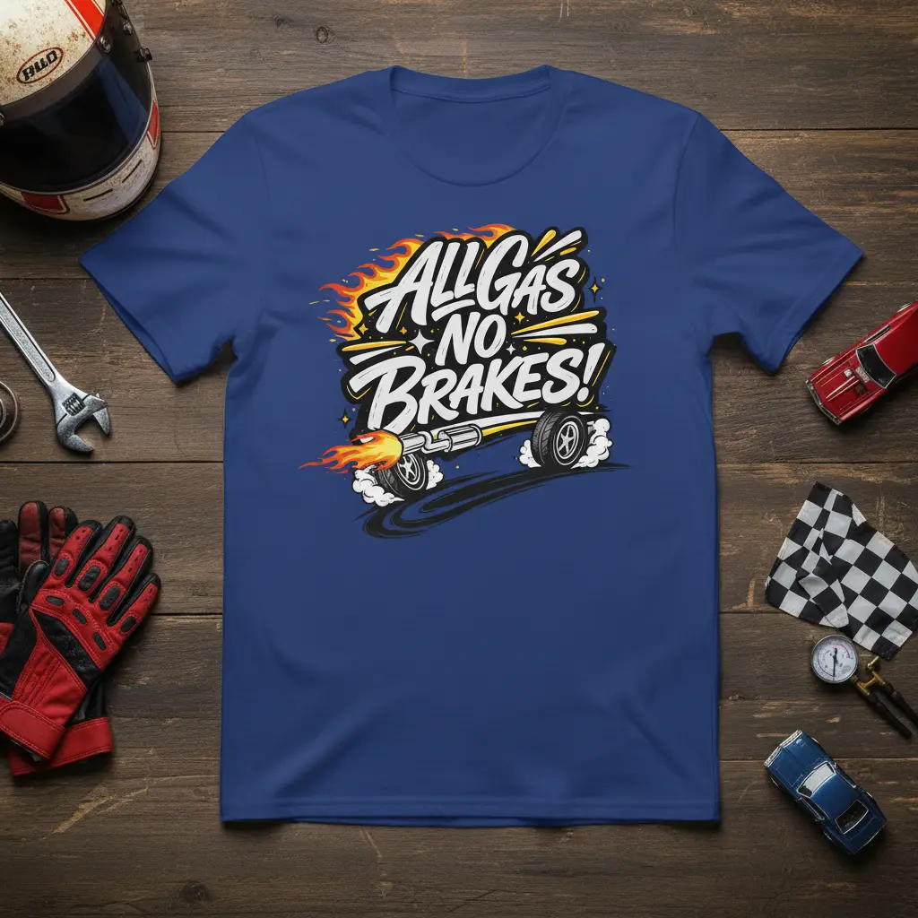 Don’t let anything hold you back from expressing your passion for cars and speed. This “ALL GAS NO BRAKES!” t-shirt is your invitation to embrace the excitement and live life at full throttle. It’s a declaration of your commitment to the automotive lifestyle and the thrill of the open road. Order yours today and experience the freedom of unrestricted driving.