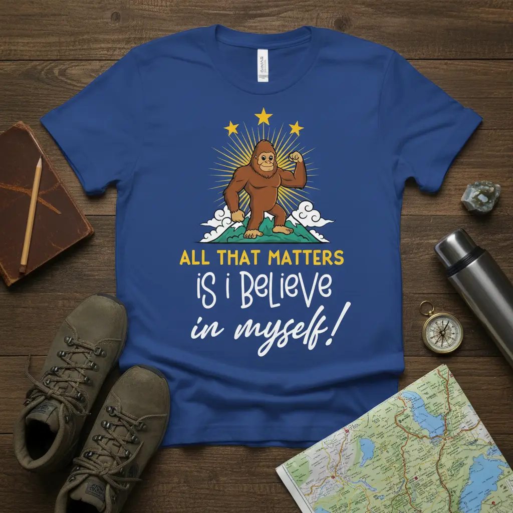 ALL THAT MATTERS IS I Believe in myself! This empowering statement comes to life on a vibrant blue t-shirt, featuring a charming and confident Bigfoot ready to inspire. It’s more than just apparel; it’s a wearable affirmation designed to uplift your spirit and remind you of your inherent strength. Perfect for hikers, adventurers, or anyone who needs a daily dose of self-belief, this tee combines a fun graphic with a powerful message. Let this shirt be a constant source of motivation, encouraging you to tackle any challenge with confidence and a positive mindset.
