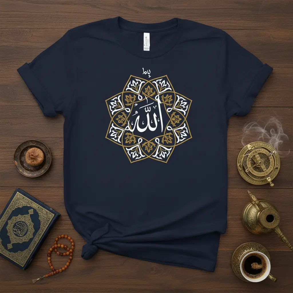 This t-shirt showcases the majestic “Allah” script, meticulously crafted within a radiant, symmetrical pattern. The interplay of white and gold against the deep navy fabric creates a visually striking contrast that is both sophisticated and spiritually uplifting. This design is a testament to the rich tradition of Islamic calligraphy, transforming a sacred word into a wearable piece of art. It’s designed for comfort and longevity, ensuring that your expression of faith remains vibrant and impactful.