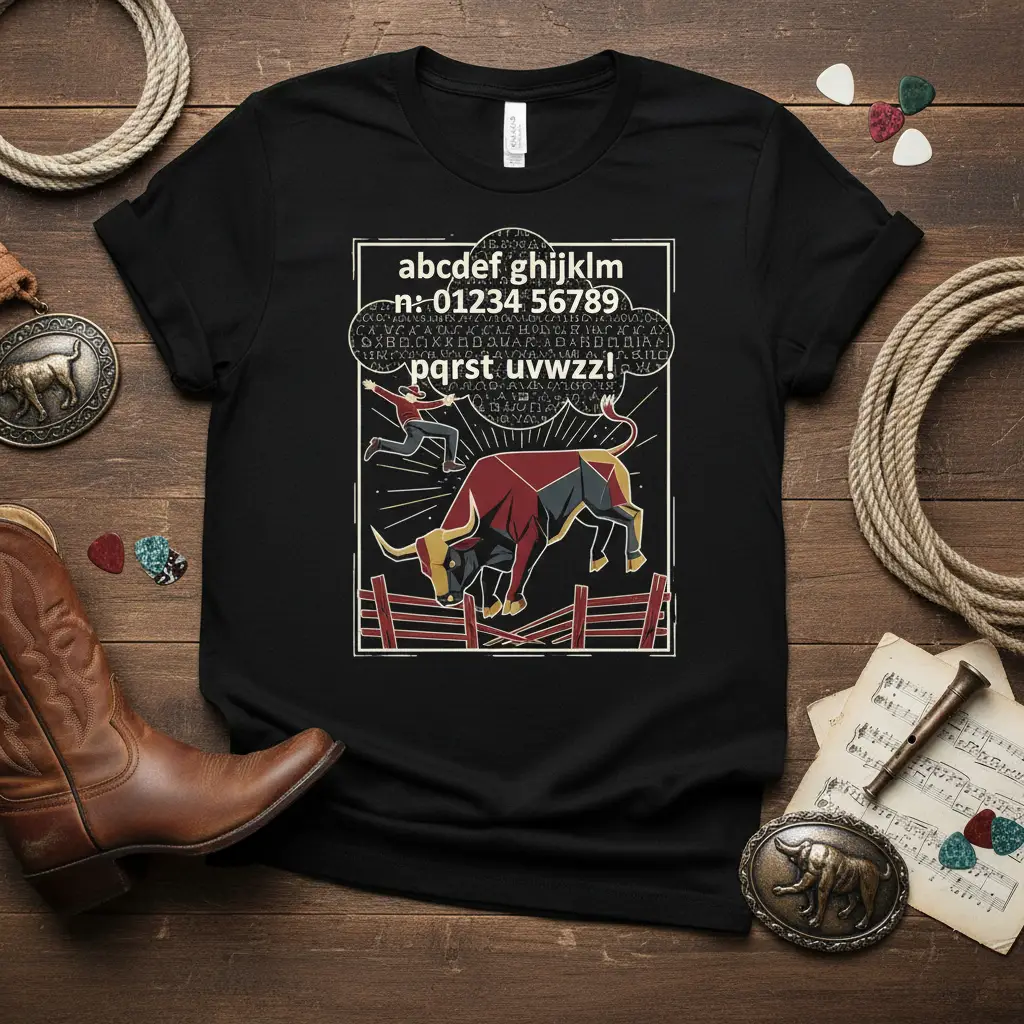 This unique graphic tee features a striking design that playfully combines the entire alphabet and a sequence of numbers with a dynamic bull-riding scene. The text “abcdef ghijklm n: 01234 56789 PQRST UVWZZ!” is central to the design, making it a perfect statement piece for those who love wordplay and a bit of challenge. It’s a fantastic way to showcase your appreciation for learning and your adventurous spirit.