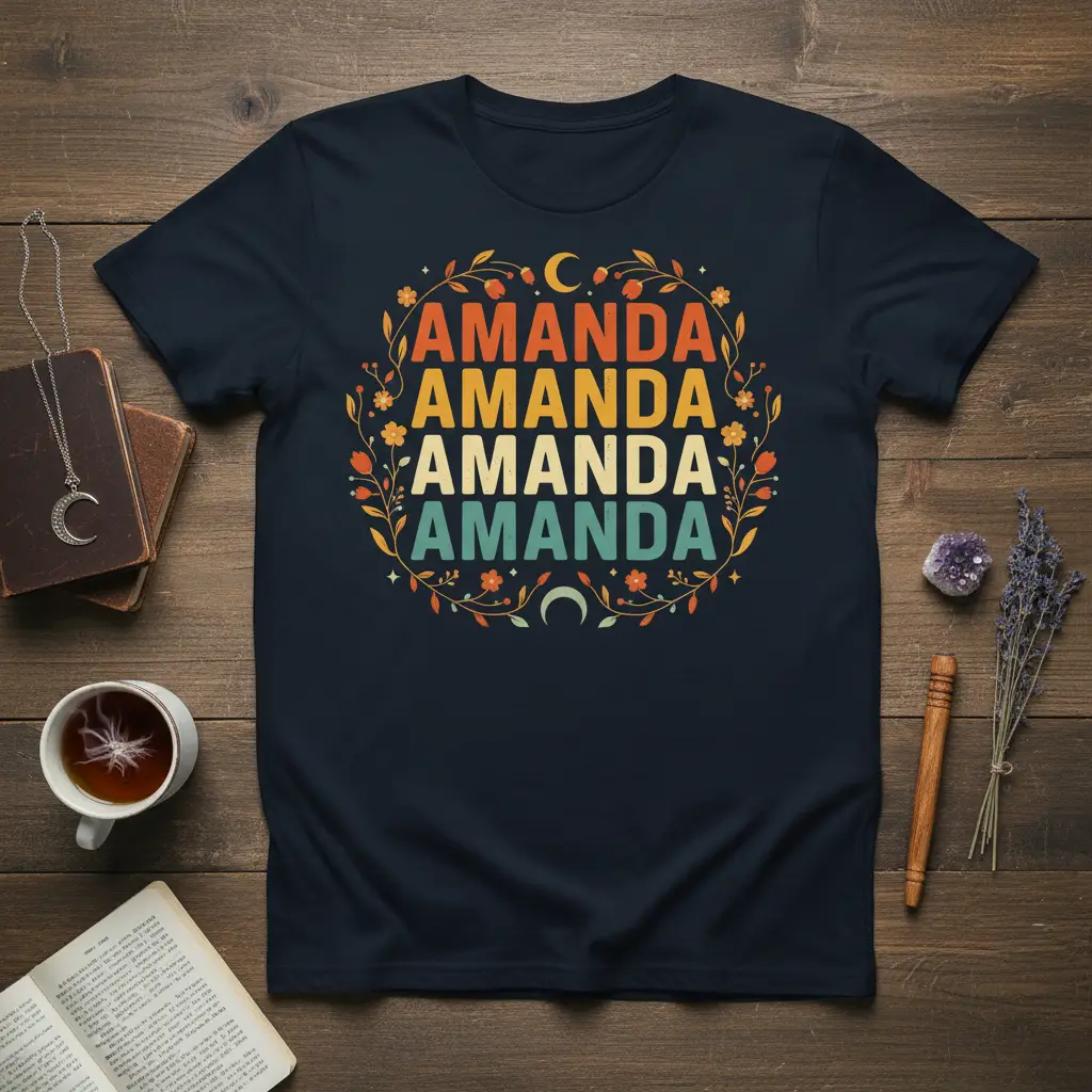 Embrace your individuality with this stunning t-shirt designed for every Amanda. The central motif is a beautiful floral wreath, artfully crafted with a vintage aesthetic. Within this wreath, the name “Amanda” is elegantly repeated four times, each instance showcasing a different harmonious color from a retro palette. This Amanda Amanda Amanda Amanda design thoughtfully incorporates elements like crescent moons and delicate floral accents, adding a touch of whimsical charm and making it stand out from ordinary apparel.