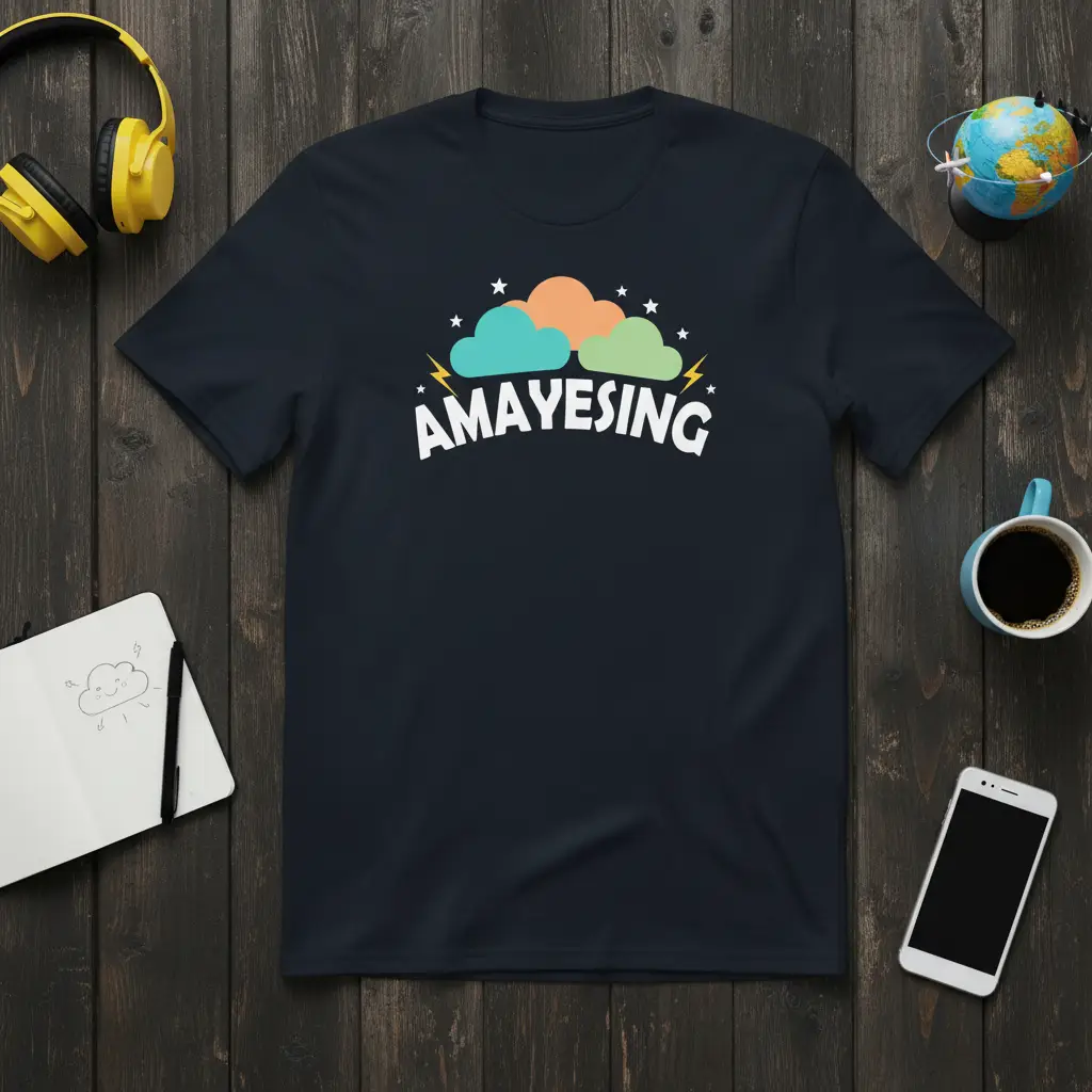 AMAYESING perfectly captures that feeling of delightful surprise and enthusiastic affirmation, making it the ultimate statement for anyone who loves to express themselves with flair. This t-shirt is more than just apparel; it’s a conversation starter, a mood booster, and a testament to the power of playful language. The design features vibrant, stylized clouds in shades of teal, orange, and green, set against a backdrop of twinkling stars and energetic lightning bolts, all framing the bold white typography. It’s crafted for comfort and designed to stand out, ensuring you look as good as you feel when wearing it.