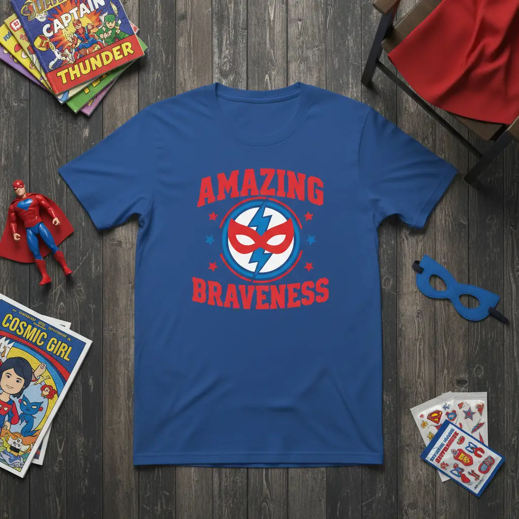 AMAZING BRAVENESS bursts to life on this vibrant blue t-shirt, designed to ignite the spirit of young heroes and celebrate their incredible courage. This tee is more than just apparel; it’s a wearable affirmation of strength, resilience, and the heroic qualities every child possesses. The striking design, featuring a bold superhero mask and a dynamic lightning bolt, is crafted to inspire confidence and encourage a brave outlook on life. It’s the perfect way for kids to showcase their inner superhero and embrace their amazing potential.