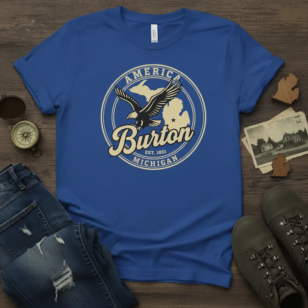 Whether you’re a lifelong resident or have fond memories of Burton, this t-shirt is a fantastic way to showcase your Michigan pride. The combination of the eagle and the state map creates a powerful visual narrative that resonates with locals and admirers alike. It’s more than just clothing; it’s a piece of wearable art that tells a story.