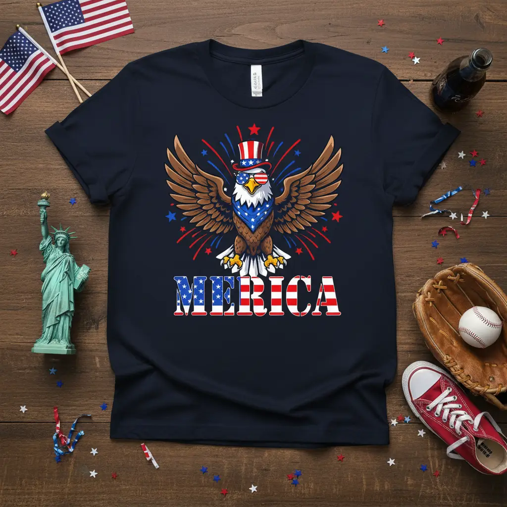 This striking t-shirt design prominently features a bold eagle graphic, embodying the spirit of liberty and independence. The eagle is depicted with wings spread wide, wearing cool sunglasses and a festive hat, ready to celebrate. Below the impressive eagle, the word “AMERICA” is spelled out in a block font, with each letter cleverly designed to resemble the stars and stripes of the American flag. Red, white, and blue fireworks burst around the eagle, adding a dynamic and festive flair to the overall design. It’s a visual representation of patriotism that resonates deeply with those who cherish the United States.