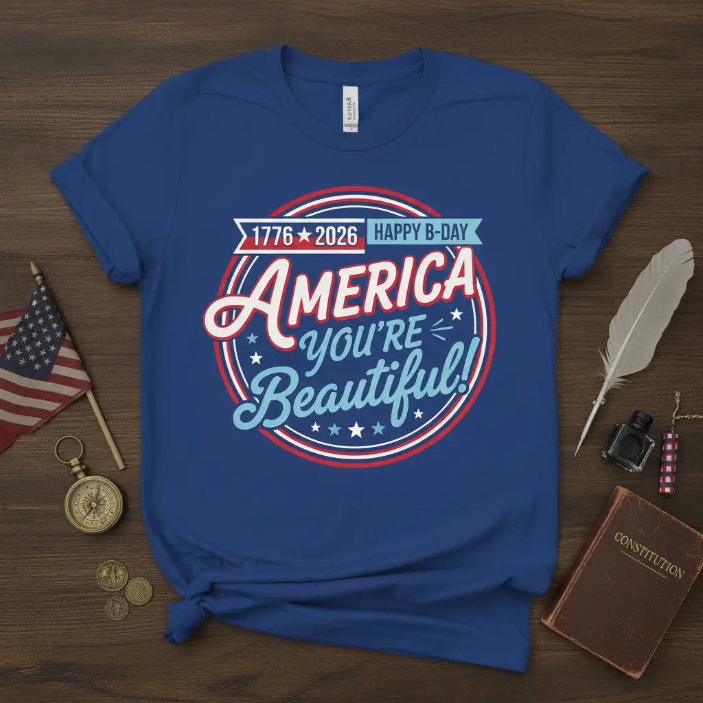 America You’re Beautiful 1776 2026 Happy B-Day is more than just a phrase; it’s a declaration of national pride and a celebration of American heritage. This unique t-shirt design captures the spirit of the nation, perfect for anyone who cherishes the land of the free and the home of the brave. Whether you’re attending a Fourth of July parade, a national holiday gathering, or simply want to showcase your patriotism daily, this tee makes a bold and beautiful statement. It honors the nation’s founding year alongside a future milestone, signifying enduring pride and celebration.