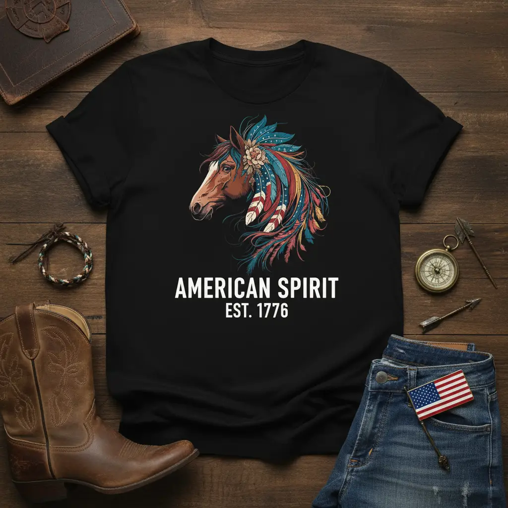 This t-shirt proudly displays the “AMERICAN SPIRIT EST. 1776” design, a powerful tribute to the founding of the United States and the enduring spirit of its people. The graphic features a beautifully rendered horse, symbolizing strength, freedom, and grace, adorned with vibrant feathers reminiscent of Native American artistry and patriotic colors. This combination creates a visually striking image that is both historically significant and aesthetically pleasing. It’s a perfect representation for anyone who feels a deep connection to American values and the equestrian world.