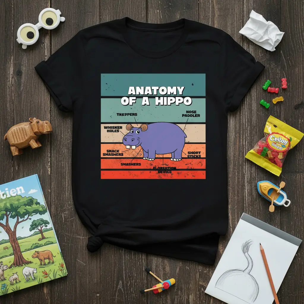 Dive into the whimsical world of hippos with our specially designed “Anatomy of a Hippo” t-shirt. This tee features a vibrant and detailed illustration of a hippopotamus, complete with a full breakdown of its comical parts. From the “Treppers” to the “Snort Sticks,” every label is crafted to bring a chuckle and spark curiosity about these incredible animals. It’s a perfect way to express your love for wildlife and humor.