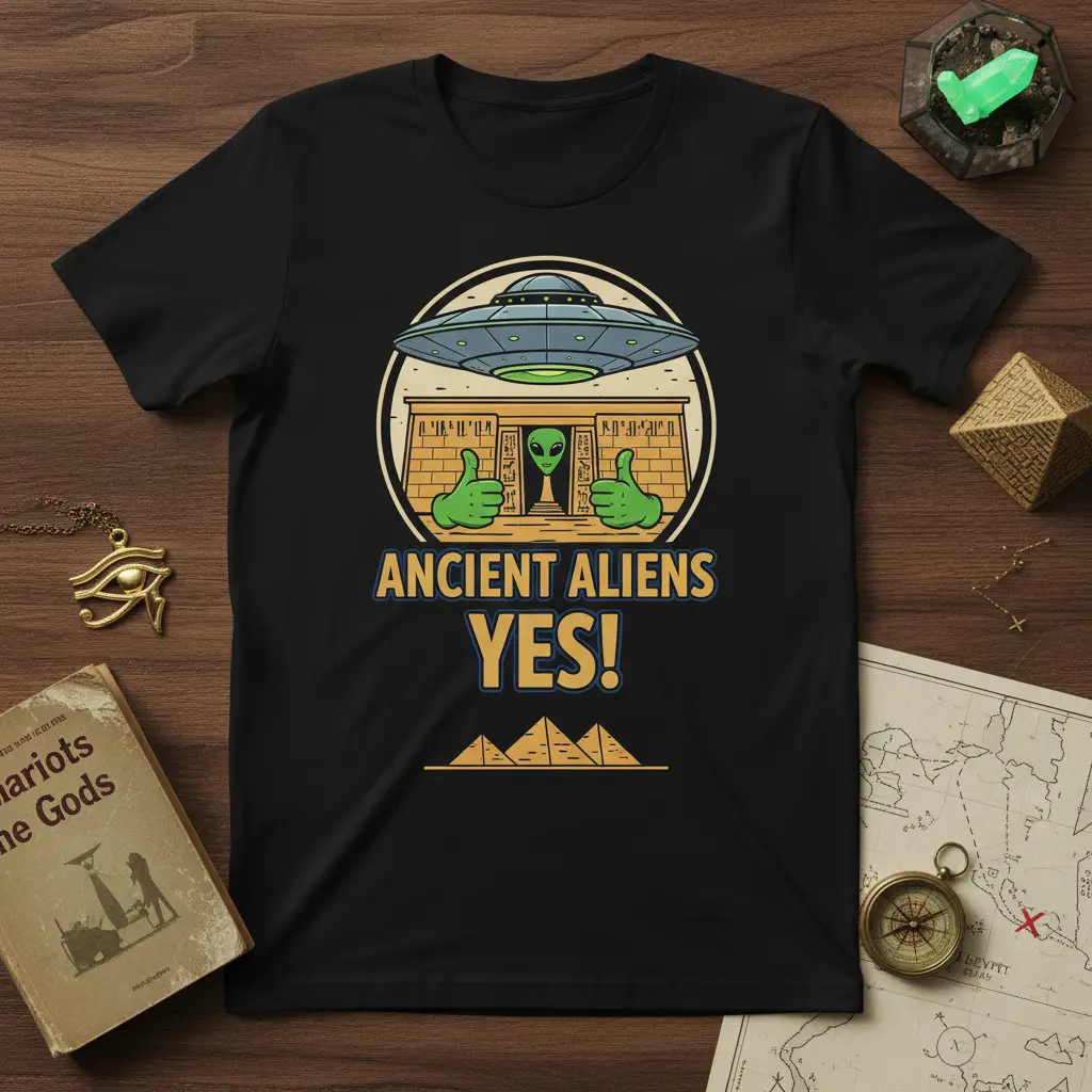Embrace the mystery with the Ancient Aliens YES! t-shirt, perfect for anyone fascinated by extraterrestrial theories and ancient civilizations. This unique design is printed on a comfortable tee, making it an ideal gift for conspiracy theorists and space alien fans alike. It’s a conversation starter that’s as intriguing as the topics it represents.
