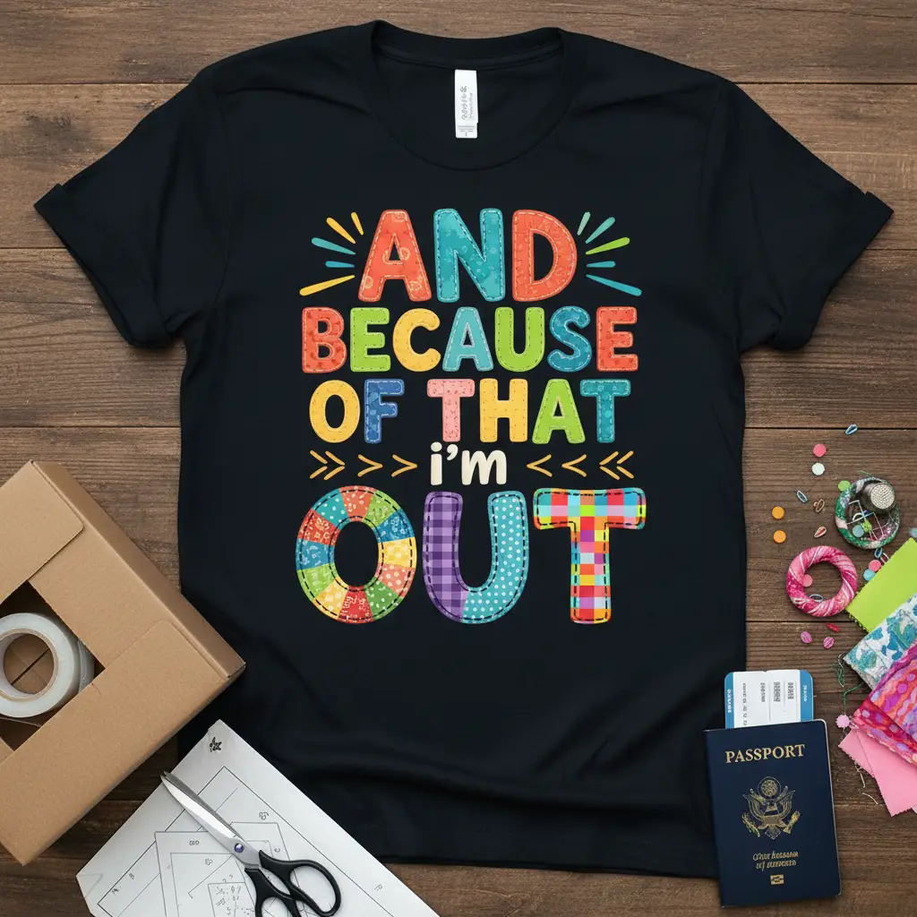 The phrase “AND BECAUSE OF THAT i’m OUT” is presented in a lively, multi-colored font. Each word is designed with a unique, textured appearance, resembling colorful fabric patches stitched together. This visual element adds a charming, handmade quality to the design, making it stand out from typical graphic tees. It’s a testament to the creativity and dedication teachers bring to their classrooms every day.