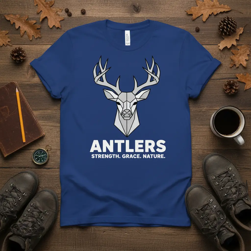 Pick from Black, Navy, Royal, Dark Heather, Red, and White to match your mood and wardrobe staples. Each colorway keeps the ANTLERS STRENGTH GRACE NATURE design clear and photo-ready for everyday wear.