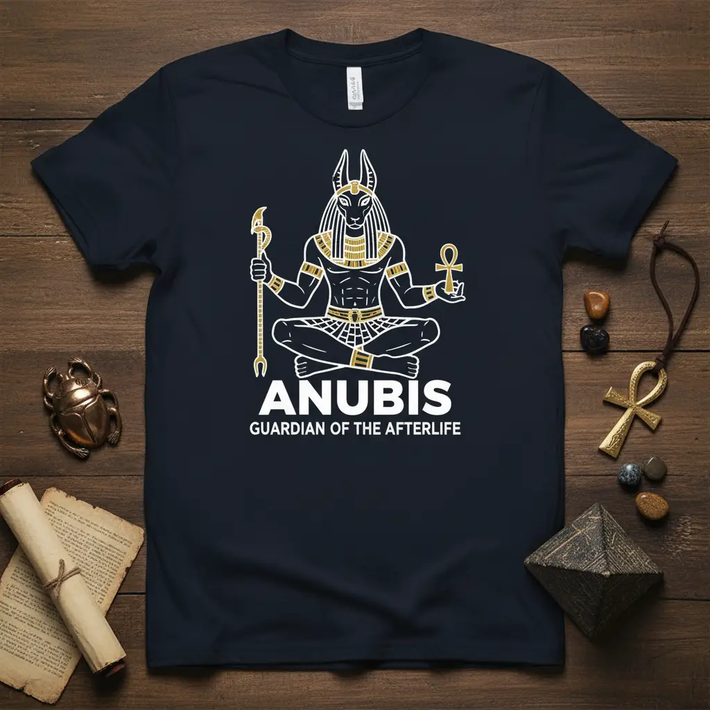 The central graphic features Anubis in a serene, seated posture, embodying his role as a divine overseer. He holds the ankh, the ancient Egyptian hieroglyphic symbol of life, in one hand, and a scepter in the other, signifying his authority and divine status. The intricate details in white and gold stand out vividly against the dark fabric, creating a look that is both elegant and powerful. This Anubis guardian of the afterlife motif is meticulously crafted to appeal to those who seek depth and meaning in their attire, offering a glimpse into the spiritual beliefs of one of history’s most enduring cultures.