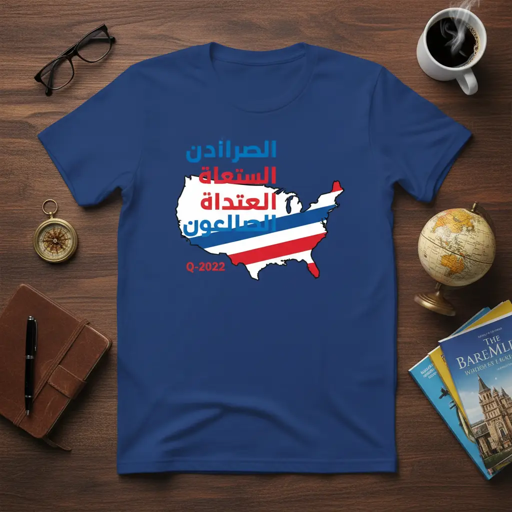 This Q-2022 inspired t-shirt is designed for those who seek apparel that goes beyond the ordinary. The deliberate choice of Arabic text, combined with the American map and patriotic colors, creates a unique statement piece. It’s an ideal garment for rallies, political discussions, or simply for expressing your convictions in everyday life. This الصرا دن الستع اة العتدا الصالعون design is sure to catch the eye and spark conversations.