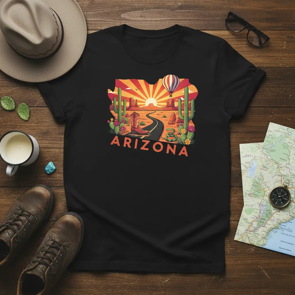 Embrace the spirit of the American Southwest with this vibrant Arizona Desert Road Trip T-Shirt, a perfect wearable souvenir for any adventurer. This eye-catching design captures the essence of Arizona’s breathtaking landscapes, featuring towering saguaro cacti, majestic mesas bathed in the warm glow of a sunrise, and a classic hot air balloon drifting lazily across the sky. A winding road invites you to imagine your own journey through this iconic terrain, making it an ideal choice for travelers, road trip enthusiasts, or anyone who cherishes the unique beauty of the Grand Canyon State. It’s more than just a t-shirt; it’s a statement of wanderlust and an ode to unforgettable experiences.