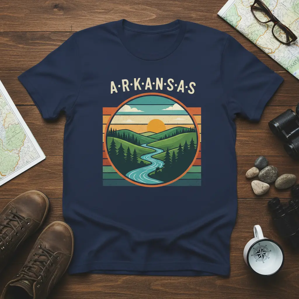 The heart of this Arkansas t-shirt lies in its captivating vintage circular design. It vividly portrays a picturesque landscape featuring rolling green hills, a gracefully winding river, and a warm, retro-style sunset painting the sky. Above this scenic vista, the state name “A•R•K•A•N•S•A•S” is thoughtfully arranged, each letter separated by a dot for a distinctive retro feel. This Arkansas Scenic River Vintage T-Shirt design perfectly encapsulates the outdoor spirit and the serene beauty that defines Arkansas, making it an ideal choice for anyone who loves the outdoors.