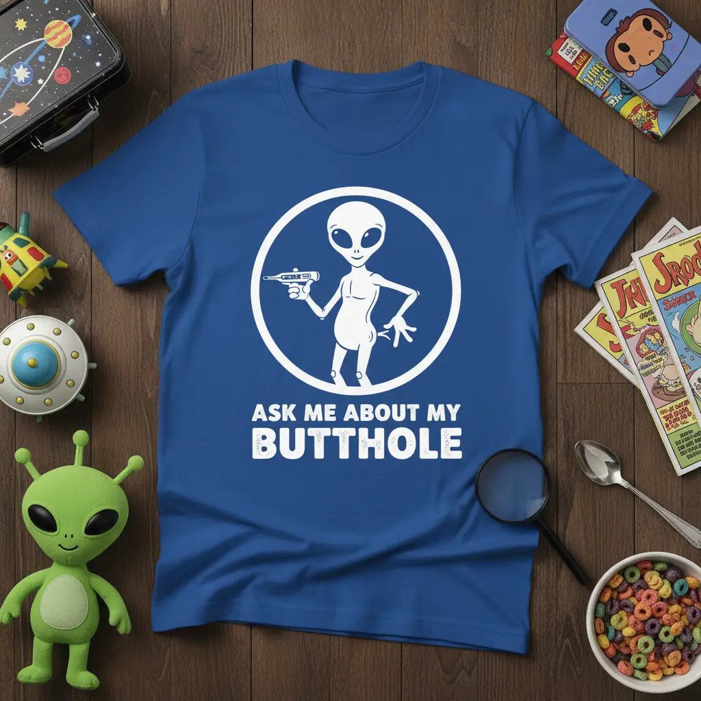 Don’t miss out on the opportunity to own this incredibly funny and eye-catching “Ask Me About My Butthole” t-shirt. It’s more than just a piece of clothing; it’s a way to express your unique sense of humor and your love for all things quirky and extraterrestrial. Whether you’re adding it to your personal collection or gifting it to someone special, this shirt is sure to be a hit. Order yours now and be ready to embrace the laughter and attention that comes with wearing such a bold and hilarious design!
