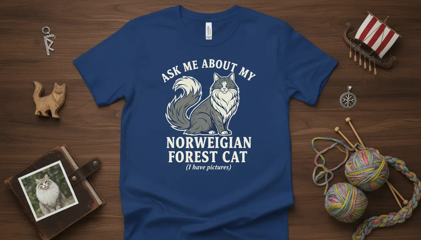 This “Ask Me About My Norwegian Forest Cat (I have pictures)” tee is a must-have for any proud owner or admirer of these majestic felines. Made from comfortable, high-quality fabric, it’s the ideal way to share your passion for your furry friend. It makes a thoughtful and unique gift for any cat lover in your life.