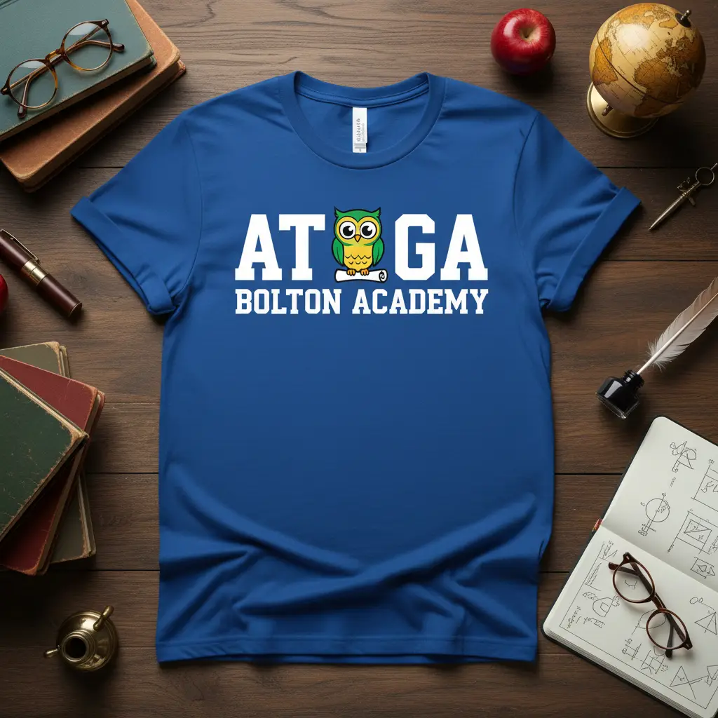 This exclusive ATOGA BOLTON ACADEMY t-shirt is designed for students, alumni, parents, and faculty who want to wear their school pride on their sleeve. The bold typography and endearing owl mascot create a unique design that stands out. It embodies the spirit of learning and achievement associated with Bolton Academy, making it a cherished item for anyone connected to the school community.