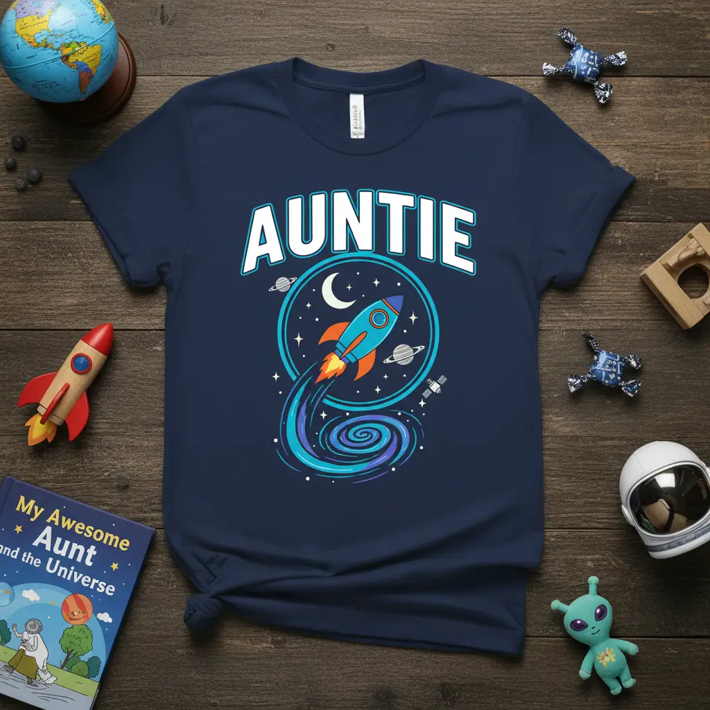 Blast off with this “Auntie” space rocket t-shirt, designed for the coolest aunts in the galaxy. It’s the perfect way to show appreciation for your favorite aunt, making it an ideal gift for birthdays or any special occasion. This comfortable and stylish tee is sure to become a favorite.