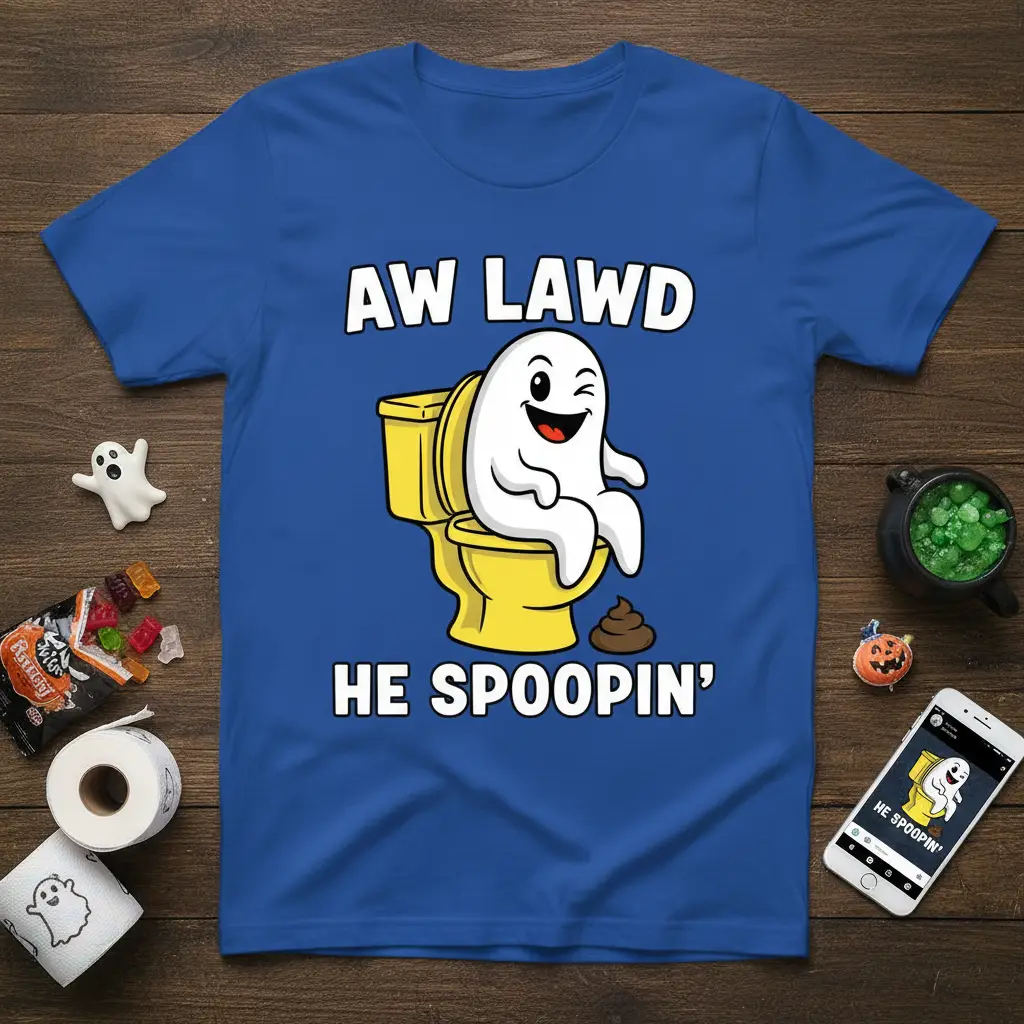 This t-shirt is crafted for maximum comedic impact, featuring a ghost in a rather compromising position on a toilet. The phrase “AW LAWD HE SPOOPIN'” has become a popular internet meme, celebrated for its witty and slightly absurd take on everyday situations. Wearing this tee is a fantastic way to express your sense of humor and connect with others who share your appreciation for funny, relatable content.